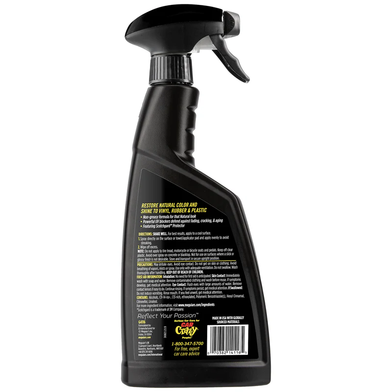 ميجوايرز ناتشورال شاين بخاخ الحل المثالي لمن يفضلون المظهر الأصلي لسياراتهم بعيداً عن اللمعان الزائد. للأسطح الداخلية والخارجية من الفينيل والمطاط والبلاستيك، مع حماية قوية ضد أشعة الشمس. تركيبته غير الدهنية تنظّف وتُلمّع وتُوفر طبقة حماية في خطوة واحدة، كما تحتوي على مضادات قوية للأشعة فوق البنفسجية تساعد على مقاومة البهتان والتشقق.